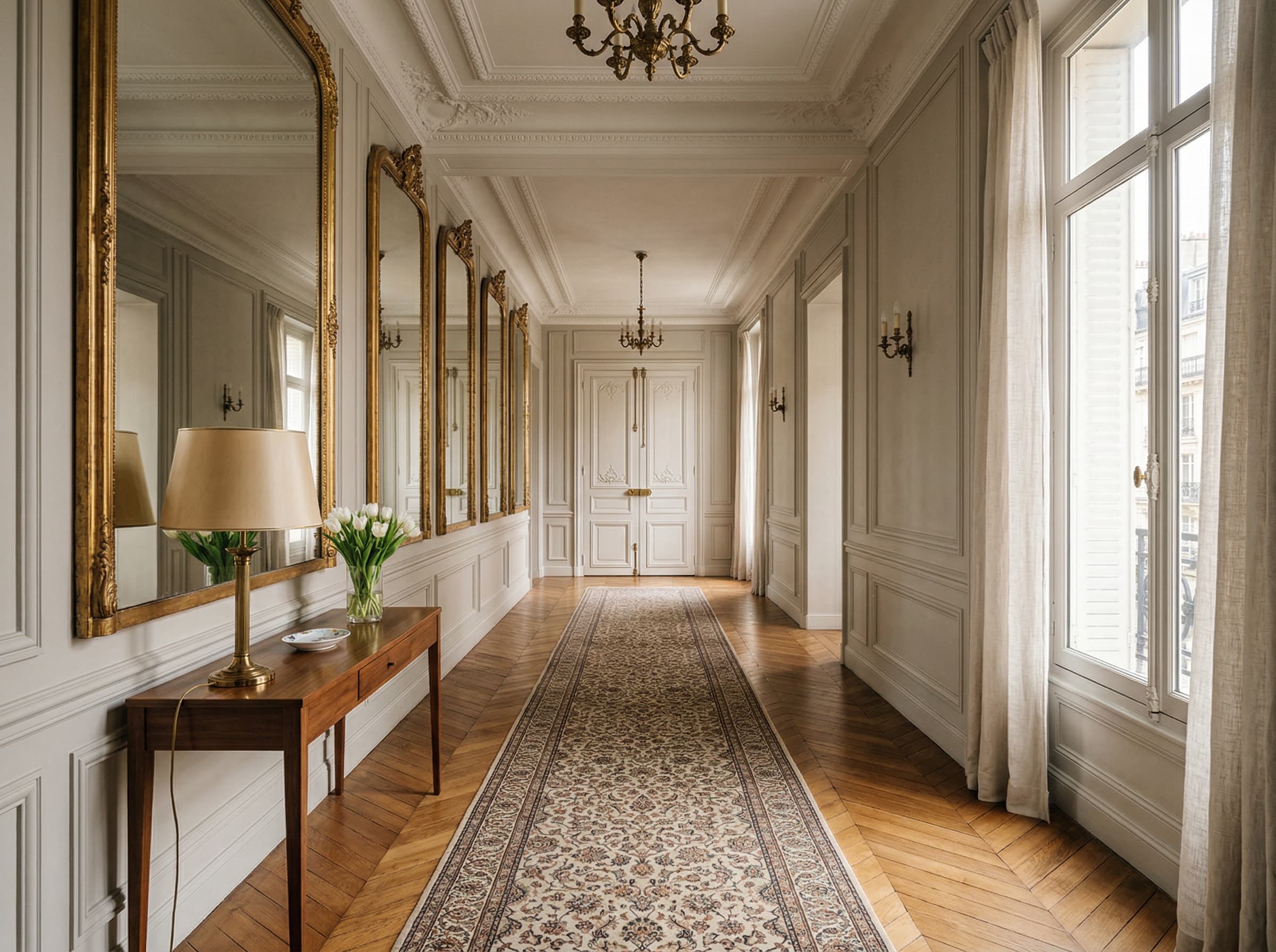 Dans un immeuble de grand standing de l'avenue Foch, un appartement familial de 310 m² distribué autour d'une galerie d'entrée de 12 m. La double réception, le bureau-bibliothèque et la salle à manger offrent toutes une vue dégagée sur les contre-allées arborées.
