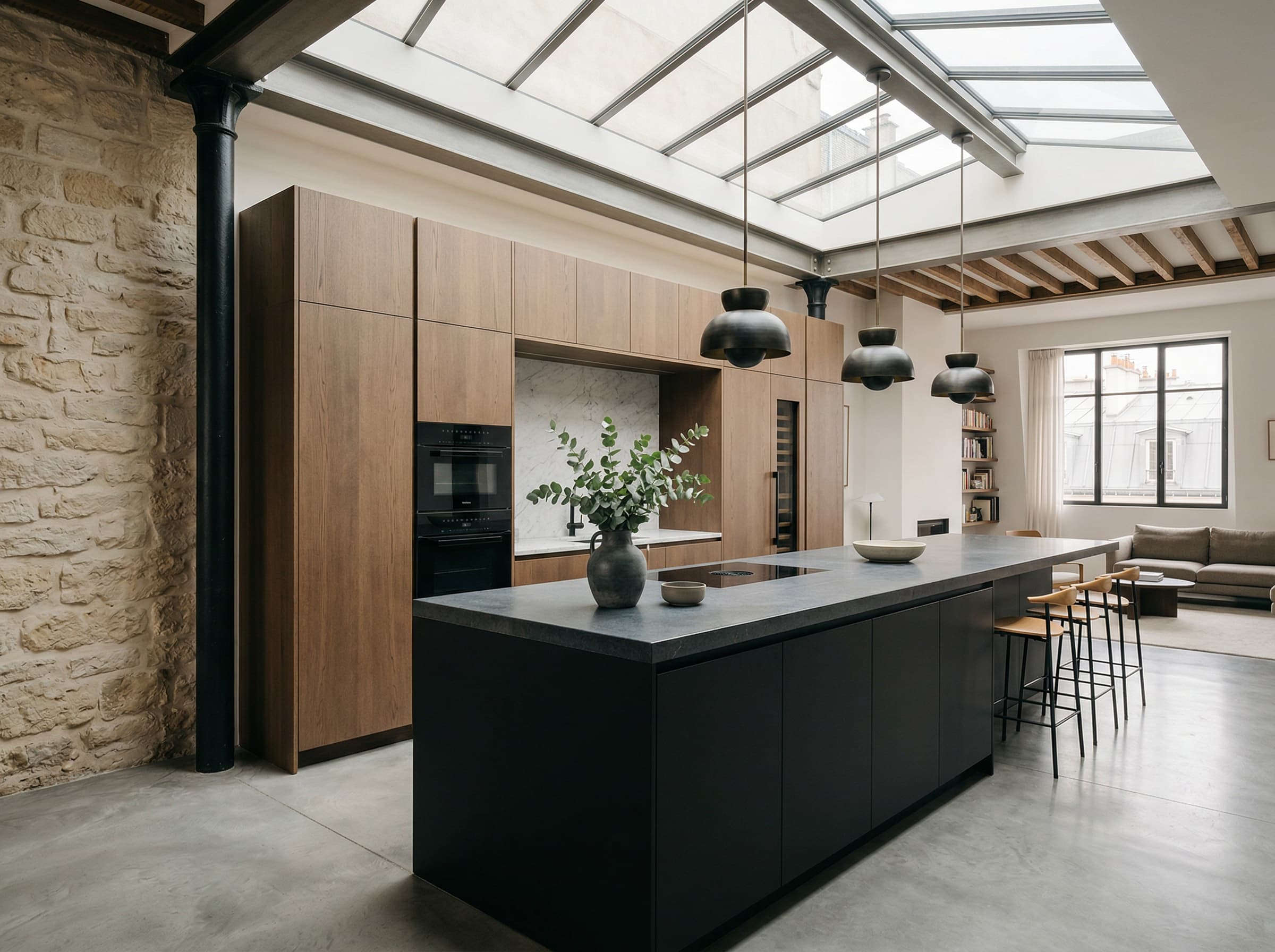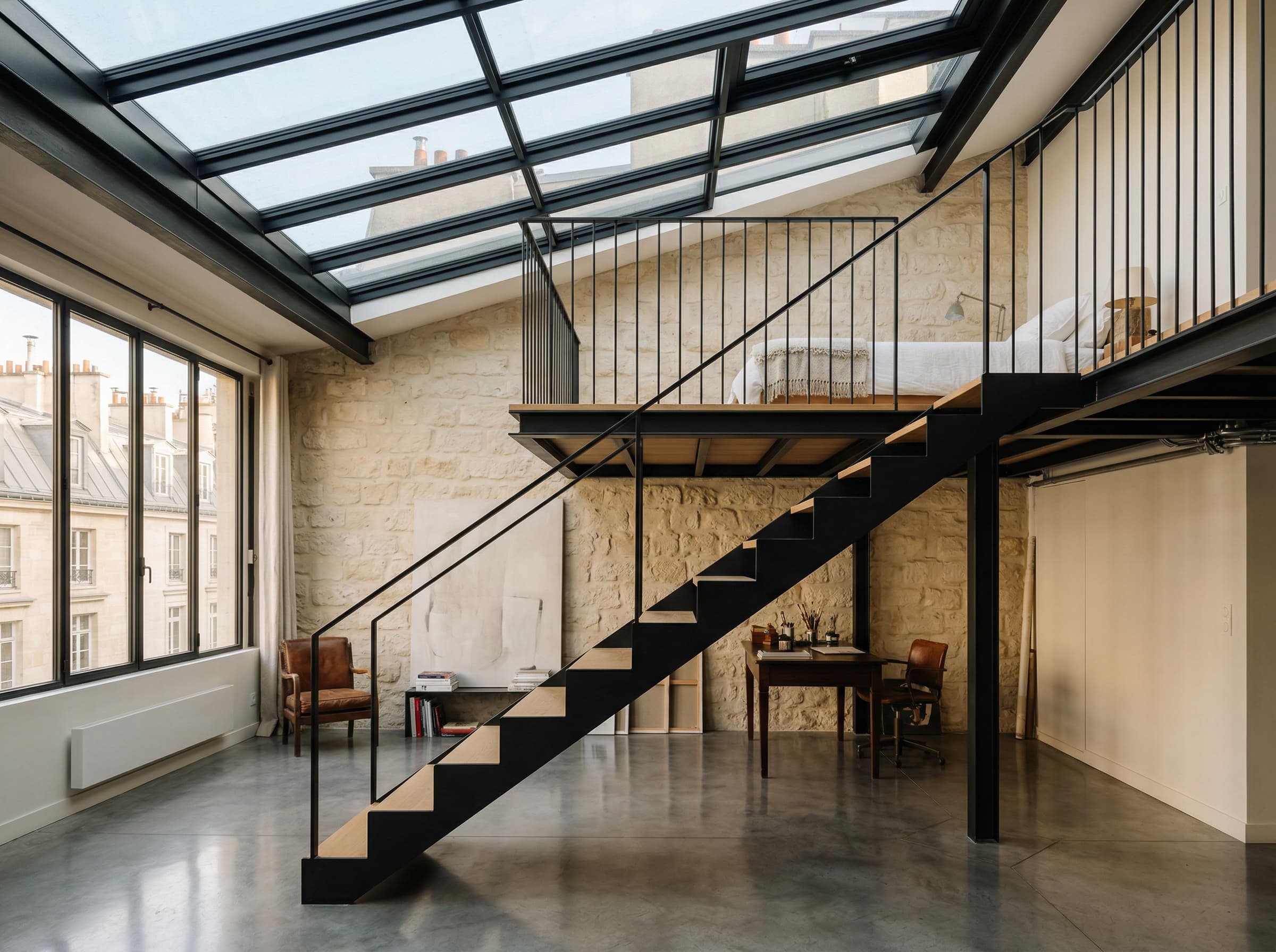 145 m² d'un seul tenant sous une verrière zénithale de 40 m². Les murs en pierre apparente, la mezzanine en métal noir et la hauteur sous plafond de 5 m composent un volume rare, dans la lignée des ateliers d'artistes du Haut Marais.