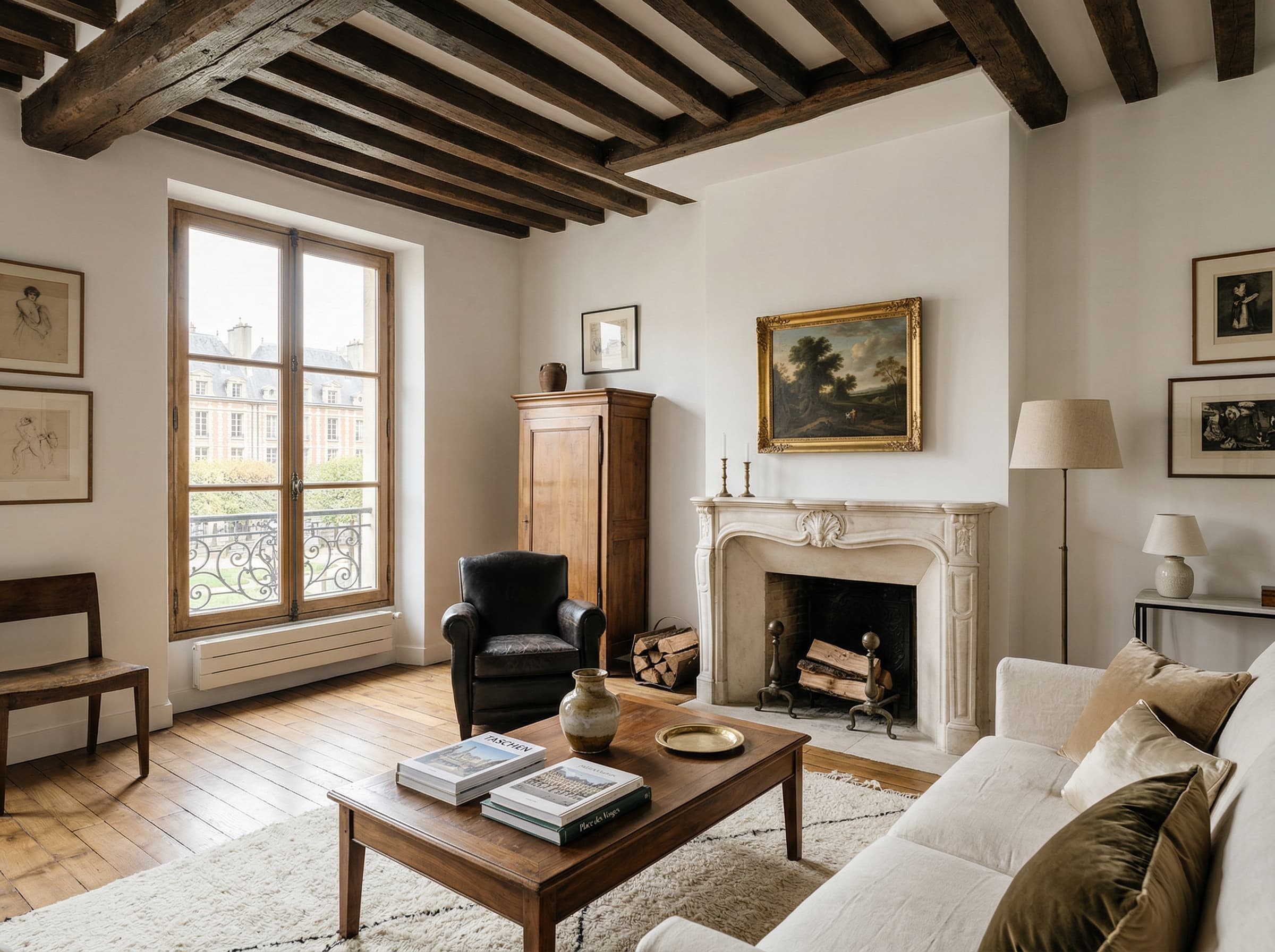 Au deuxième étage d'un pavillon emblématique de la Place des Vosges, ce pied-à-terre de 78 m² dévoile une double exposition remarquable et une vue plongeante sur la place et ses arcades. Poutres apparentes, parquet ancien et cheminée en pierre signent l'âme du lieu.