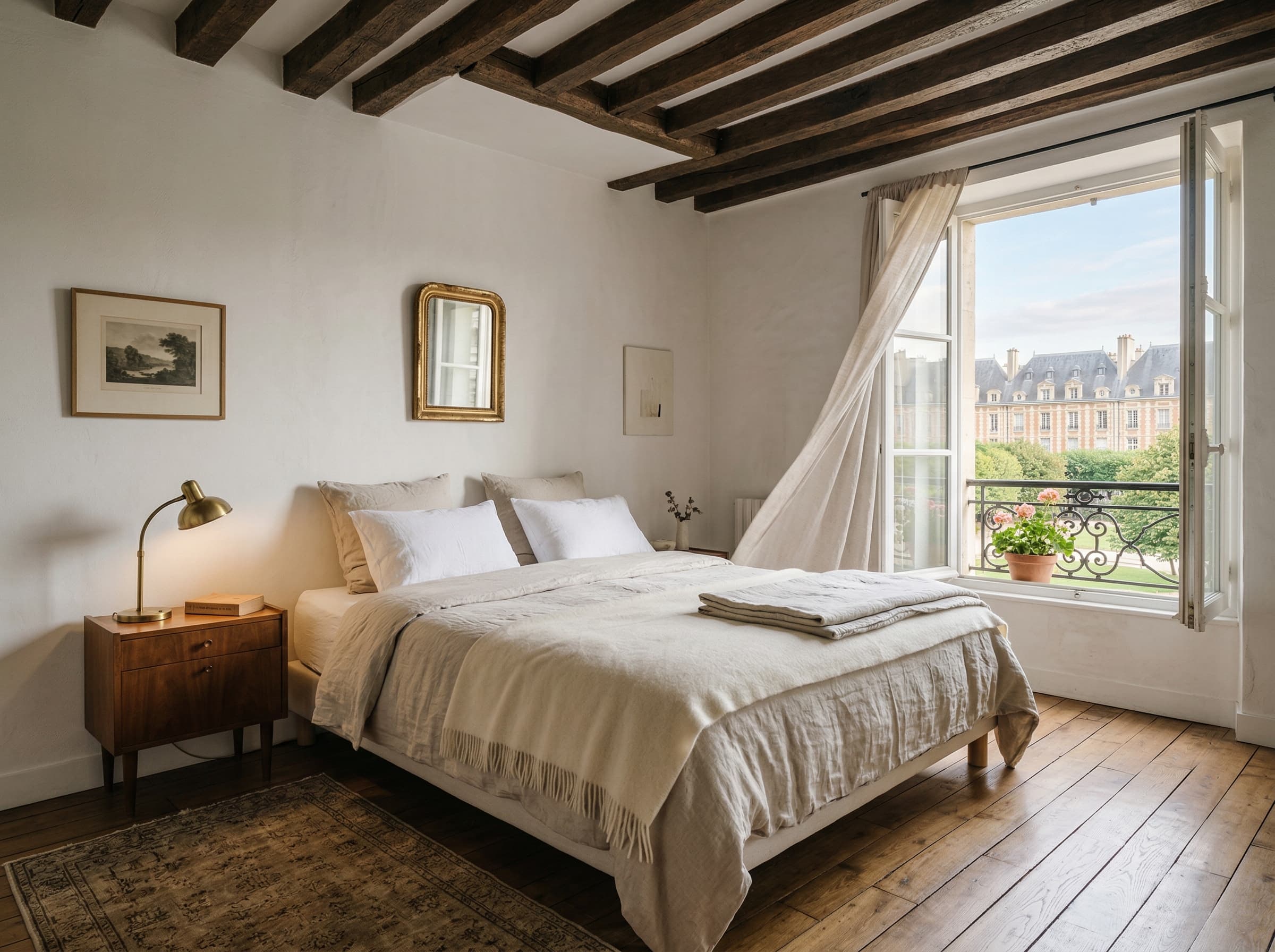 Sous les arcades de la Place des Vosges, un pied-à-terre de 78 m² à la lumière du Marais.
